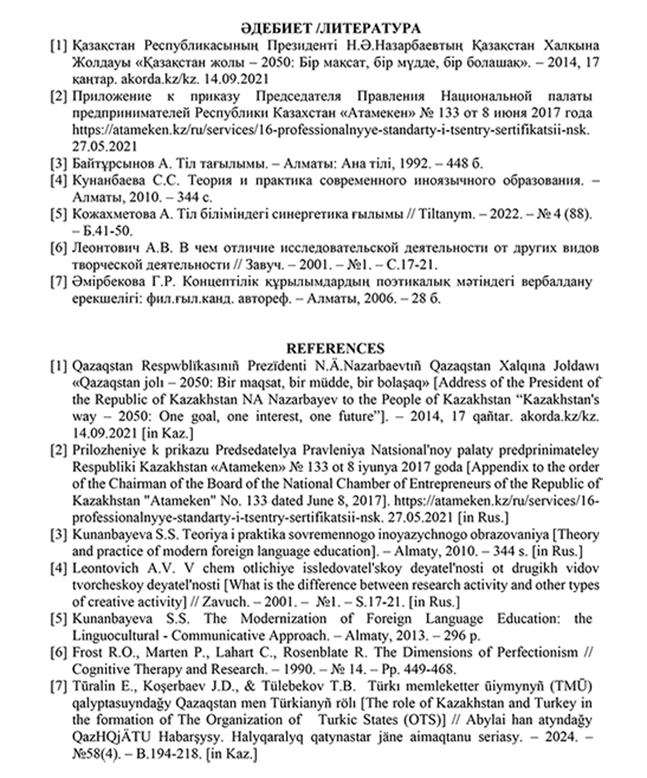- Список литературы на казахском и русском языке оформляется согласно ГОСТ 7.1-2003 «Библиографическая запись. Библиографическое описание. Общие требования и правила составления». (См. Пример статьи)